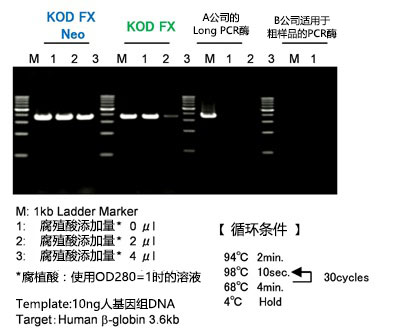 这里,以人基因组DNA中混入腐殖酸为例,探讨了其对PCR的抑制作用。结果显示,KOD FX Neo对抗腐殖酸的能力最强。